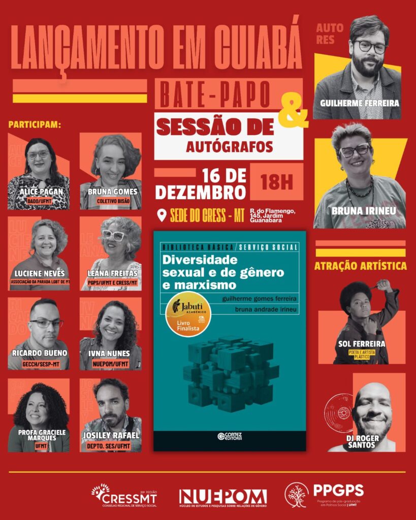 Na próxima terça-feira (16), acontece o lançamento de “Diversidade Sexual e de Gênero & Marxismo” (Editora Cortez), que coloca a produção acadêmica de Mato Grosso no centro do cenário literário nacional. A obra chega ao público com o selo de finalista do Prêmio Jabuti Acadêmico 2025, um dos principais reconhecimentos literários do país. O evento será realizado na sede do Conselho Regional de Serviço Social de Mato Grosso (CRESS/MT), a partir das 18h.