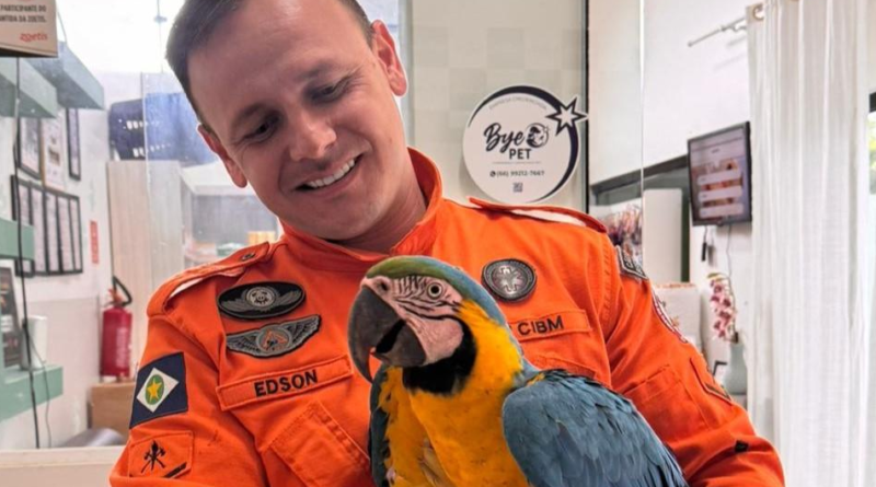 Corpo de Bombeiros resgata arara-canindé em indústria de carne suína